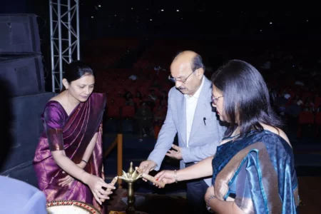 સભાને સંબોધતાં ડૉ. વી. કે. શર્માએ વિદ્યાર્થીઓ અને શિક્ષકોના અસાધારણ પ્રયત્નોની પ્રશંસા કરી અને શૈક્ષણિક ઉત્તમતા સાથે સર્જનાત્મકતાના પોષણના મહત્વ પર ભાર મૂક્યો. તેમણે જણાવ્યું કે આવા ભવ્ય મંચો આત્મવિશ્વાસી, સંવેદનશીલ અને જવાબદાર વૈશ્વિક નાગરિકોના ઘડતરમાં મહત્વપૂર્ણ ભૂમિકા ભજવે છે. આશા મેડમએ યુવા કલાકારોની નિષ્ઠા, ઊર્જા અને કલાત્મક અભિવ્યક્તિની દિલથી પ્રશંસા કરી.