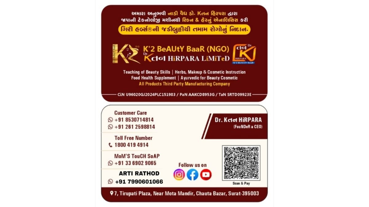 - K2 બ્યુટી બાર (NGO) અને ડો. Kતન હિરપરા લિમિટેડ કંપની (સુરત)